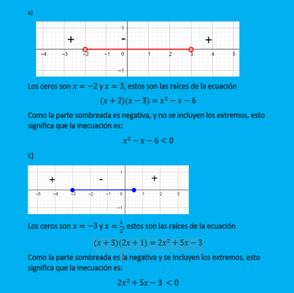 Las inecuaciones cuadráticas requieren del análisis de los signos. Cada imagen representa el conjunto solución de una inecuación, analiza e identifica el intervalo y la inecuación correspondiente a cada representación