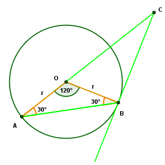 120 º + 2 ⋅ ∢ OAB = 180 º 120º` +` 2~ cdot %angle OAB "=" 180º