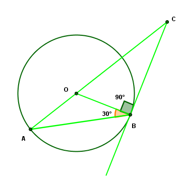CB CB tangente a la circunferencia en B B , A A , O O y C C puntos alineados, ∢ COB = 60 º %angle COB "=" 60º