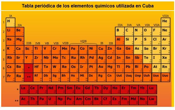 La tabla periódica de 18 columnas, está formada por siete hileras horizontales nombradas períodos y 18 columnas denominadas grupos que se nombran con números romanos seguidos de las letras A o B mayúscula, según el tipo de elemento que represente.