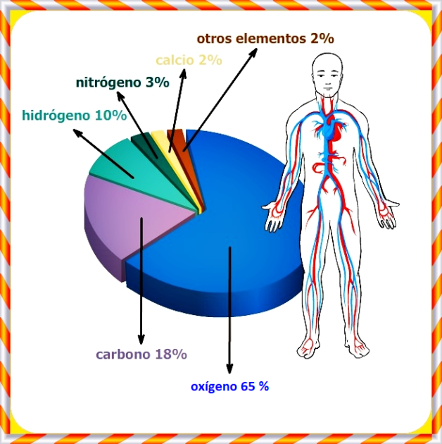 En el organismo humano están presentes varios elementos químicos. De acuerdo a su porcentaje de presencia podemos ordenarlos y citar al oxígeno, carbono, hidrógeno, nitrógeno, calcio, fósforo, potasio, azufre, sodio, magnesio, en forma de trazas encontramos al flúor, cloro, manganeso, hierro, cobalto, cobre, zinc, selenio, iodo y molibdeno.