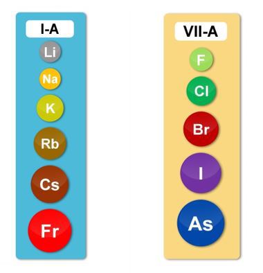Los elementos agrupados de acuerdo con su número atómico, manifiestan determinadas características. Por ejemplo, el sodio, el cobre y el oro tienen en común, pocos electrones en su último nivel, muestran propiedades metálicas. Por el contrario, el oxígeno, el cloro y el yodo tienen muchos electrones en su último nivel, son no metales.