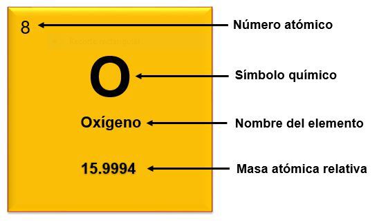 La tabla periódica consta de casillas o cuadros que contiene el nombre del elemento, el símbolo[4], el número atómico[5] y la masa atómica relativa, entre otros elementos en dependencia del tipo de tabla.
